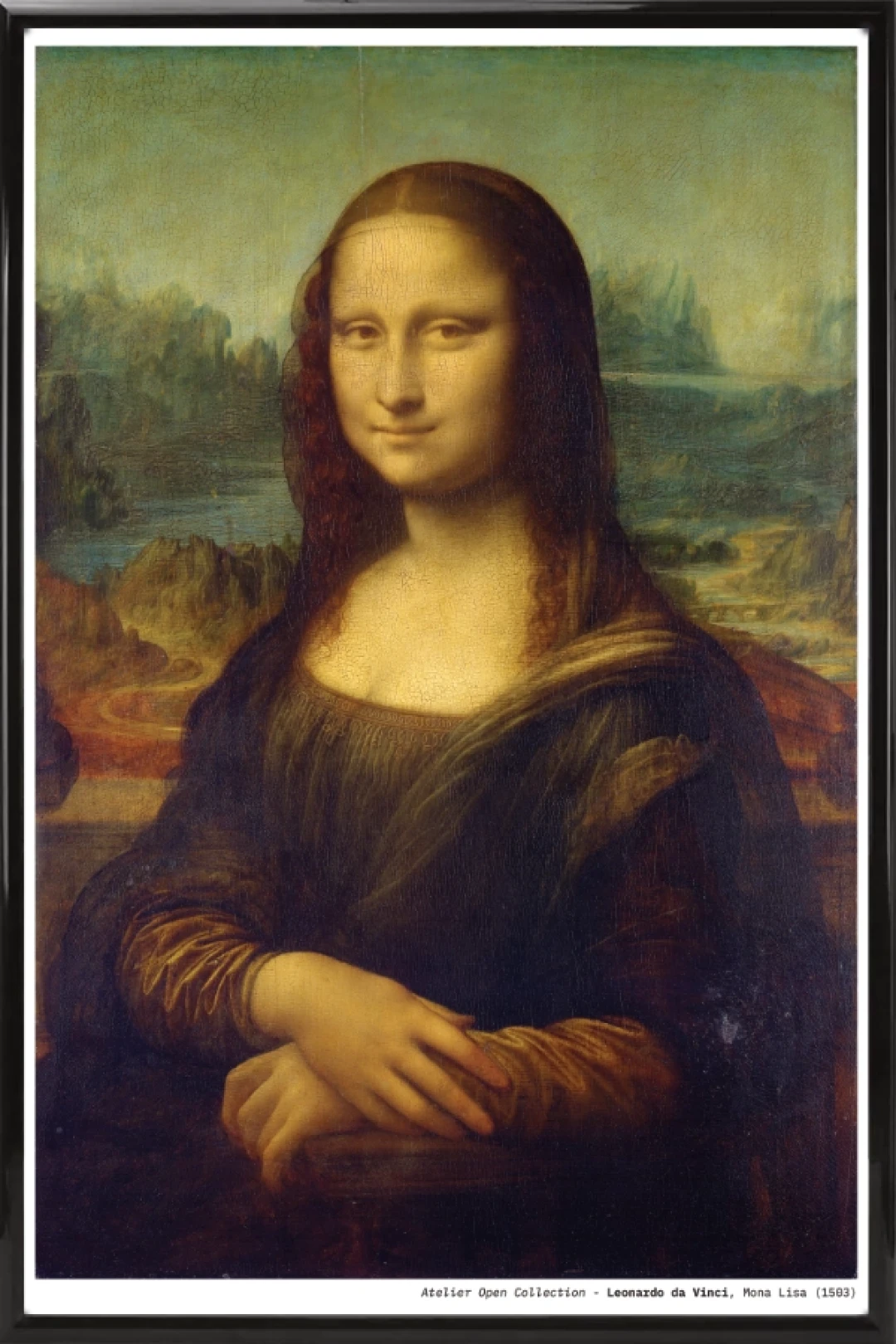 The Mona Lisa is one of the most celebrated portraits in the history of art, renowned for its soft sfumato modeling, serene expression, and harmonious balance. Painted by Leonardo da Vinci during the height of the Italian Renaissance, the work invites viewers into a quiet moment of poise and mystery. Its atmospheric landscape, delicate textures, and iconic smile make it a masterpiece admired for over 500 years. Printed in-house on museum-grade materials, this reproduction preserves the depth, warmth, and fine detail of Leonardo’s original vision.