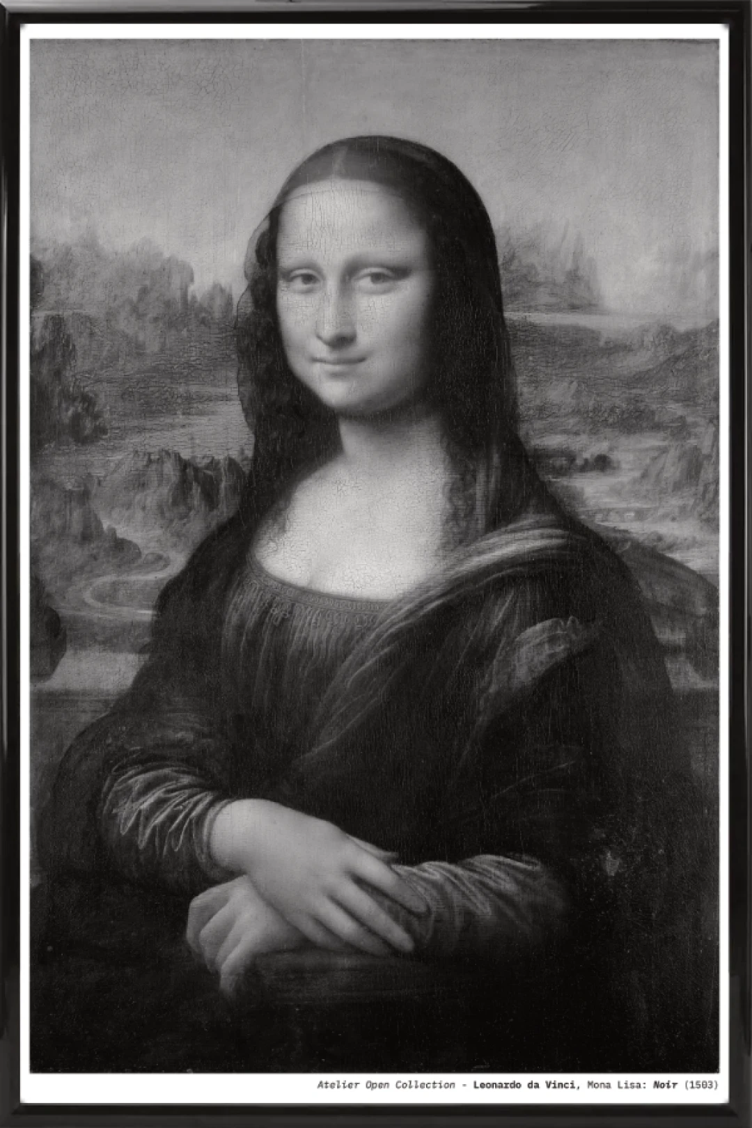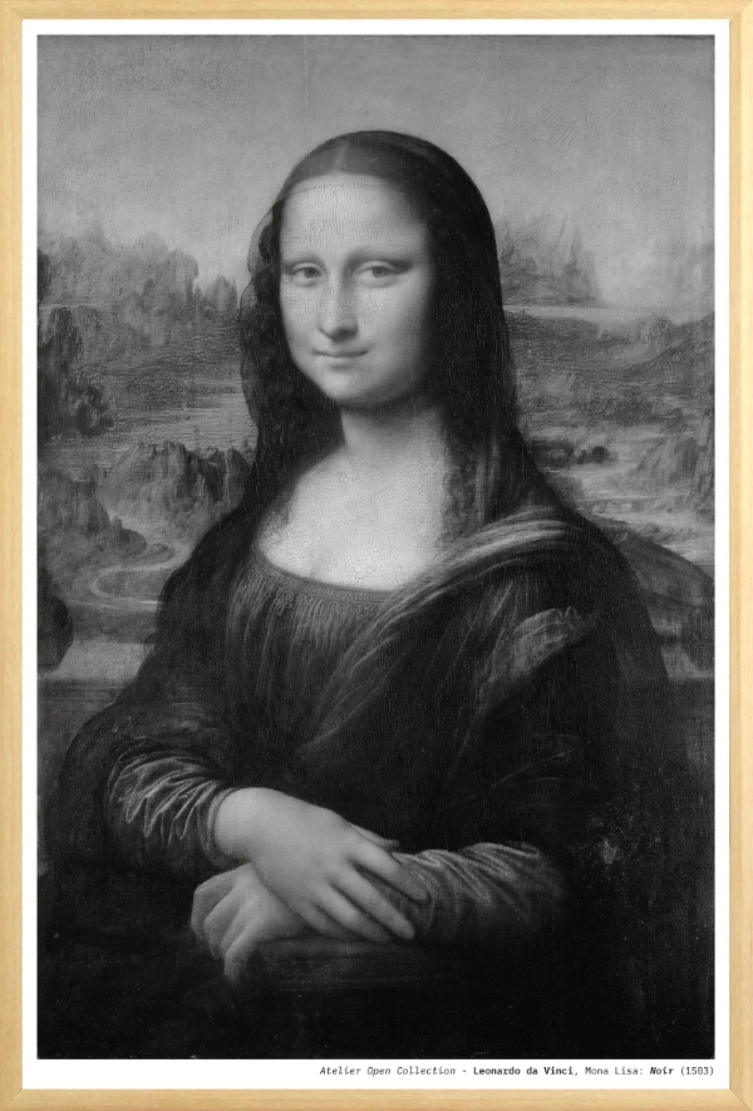 This Noir Edition of Mona Lisa transforms Leonardo da Vinci’s iconic portrait into a striking black-and-white artwork. By removing the original color palette, the viewer is invited to see the painting through a new lens; one that emphasizes form, shadow, expression, and the delicate sfumato technique that defines the original. The monochrome treatment enhances the sitter’s enigmatic gaze and highlights the tonal subtleties that often disappear behind centuries of varnish and aging. Printed with museum-grade precision, this edition blends classic Renaissance beauty with contemporary photographic elegance.