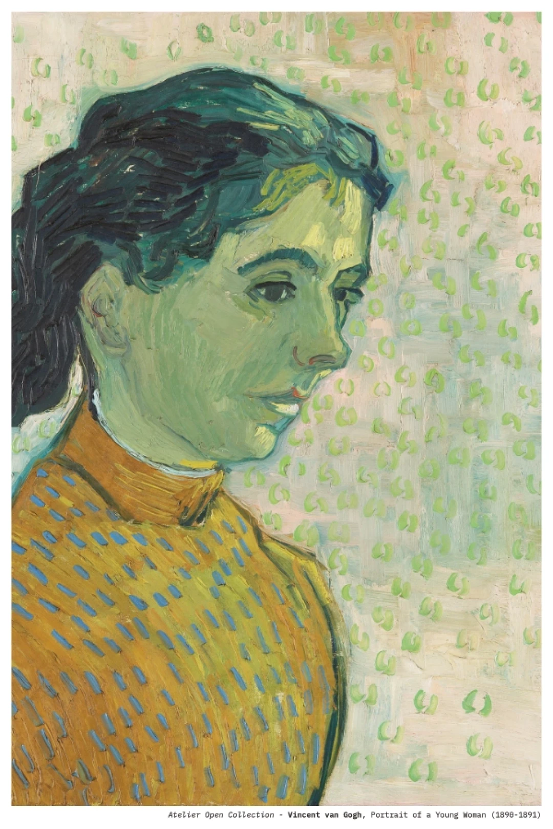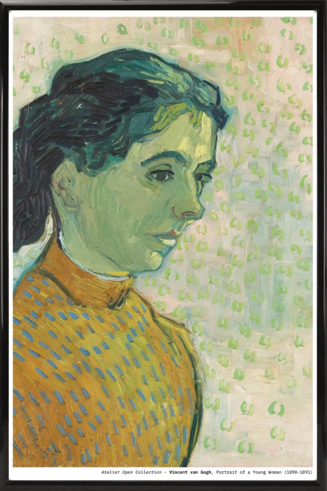 This gentle and intimate portrait showcases Van Gogh’s remarkable ability to capture emotion through color and brushstroke. Portrait of a Young Woman reveals a contemplative sitter painted with soft greens, golden tones, and a patterned background that adds rhythmic texture without overpowering her quiet presence. The expressive outlines and fluid brushwork reflect the artist’s late style, where color harmony and psychological depth come together in a deeply personal, observational study.