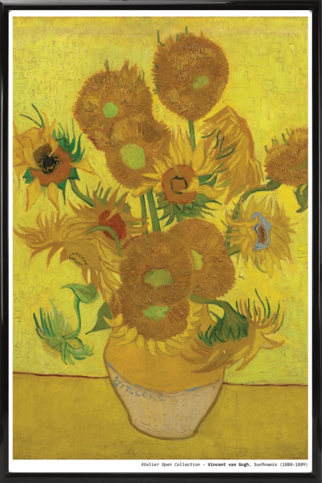 Van Gogh’s Sunflowers is one of the most beloved and recognizable works in Western art. Painted in Arles as part of a series intended to welcome his friend Paul Gauguin, these sunflowers capture warmth, movement, and optimism through their radiant yellows and expressive brushwork. The energetic petals and textured centers seem almost alive, creating a dynamic still life overflowing with personality. This museum-grade reproduction preserves the luminous palette and sculptural paint strokes that define the original, making it a perfect statement piece for living rooms, studios, or spaces that crave brilliant color and creative energy.