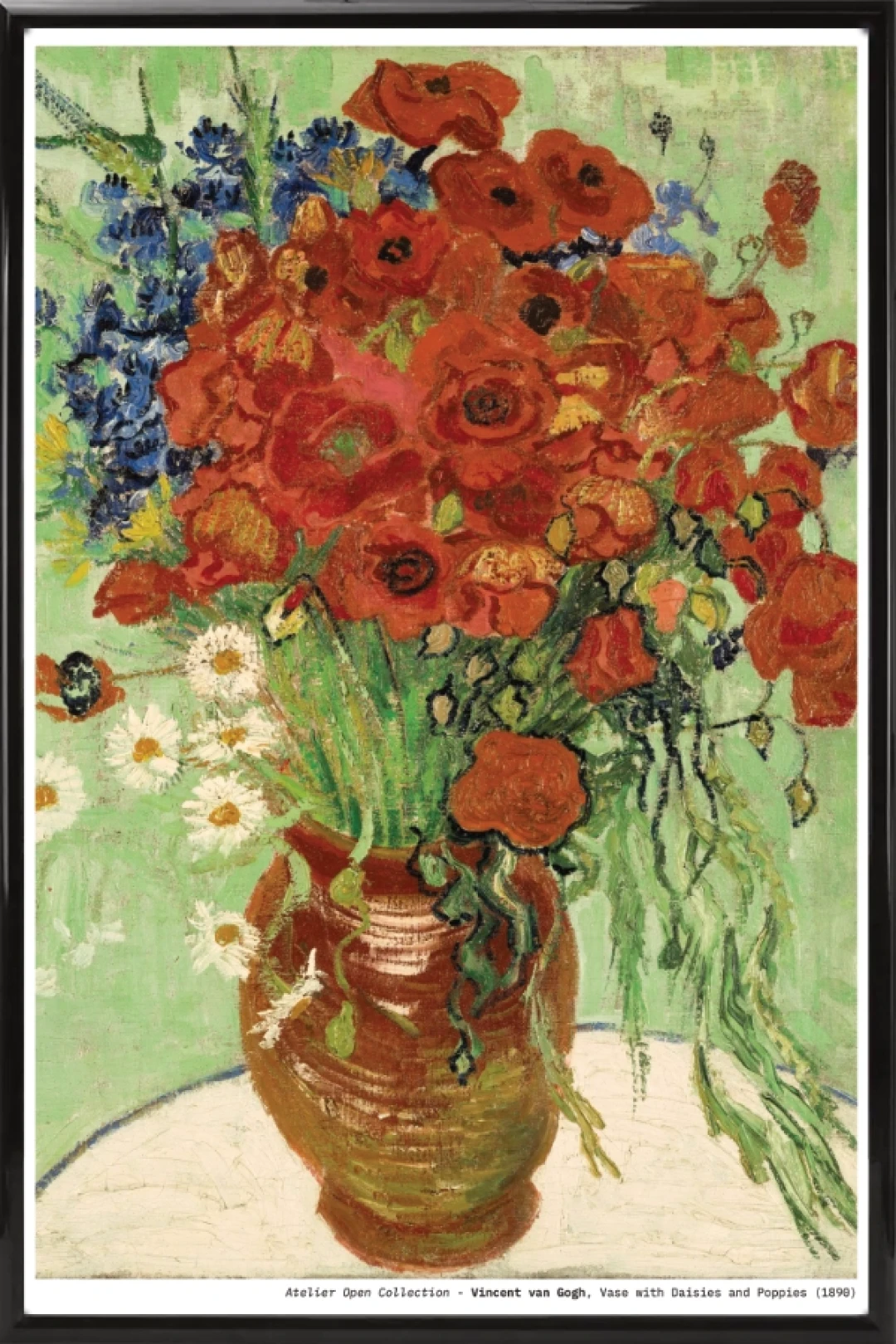 Vase with Daisies and Poppies is a vibrant floral arrangement painted during Van Gogh’s final months in Auvers-sur-Oise. The bold reds of the poppies burst forward against soft white daisies and cool blue blossoms, all set within a warm earthen vase. The mint-green background enhances the brightness of the bouquet, creating a composition that feels at once spontaneous and deeply expressive. This museum-quality reproduction preserves the rich textures and confident brushwork that give the painting its joyful energy- ideal for brightening living rooms, creative studios, dining areas, or any space that benefits from uplifting color.
