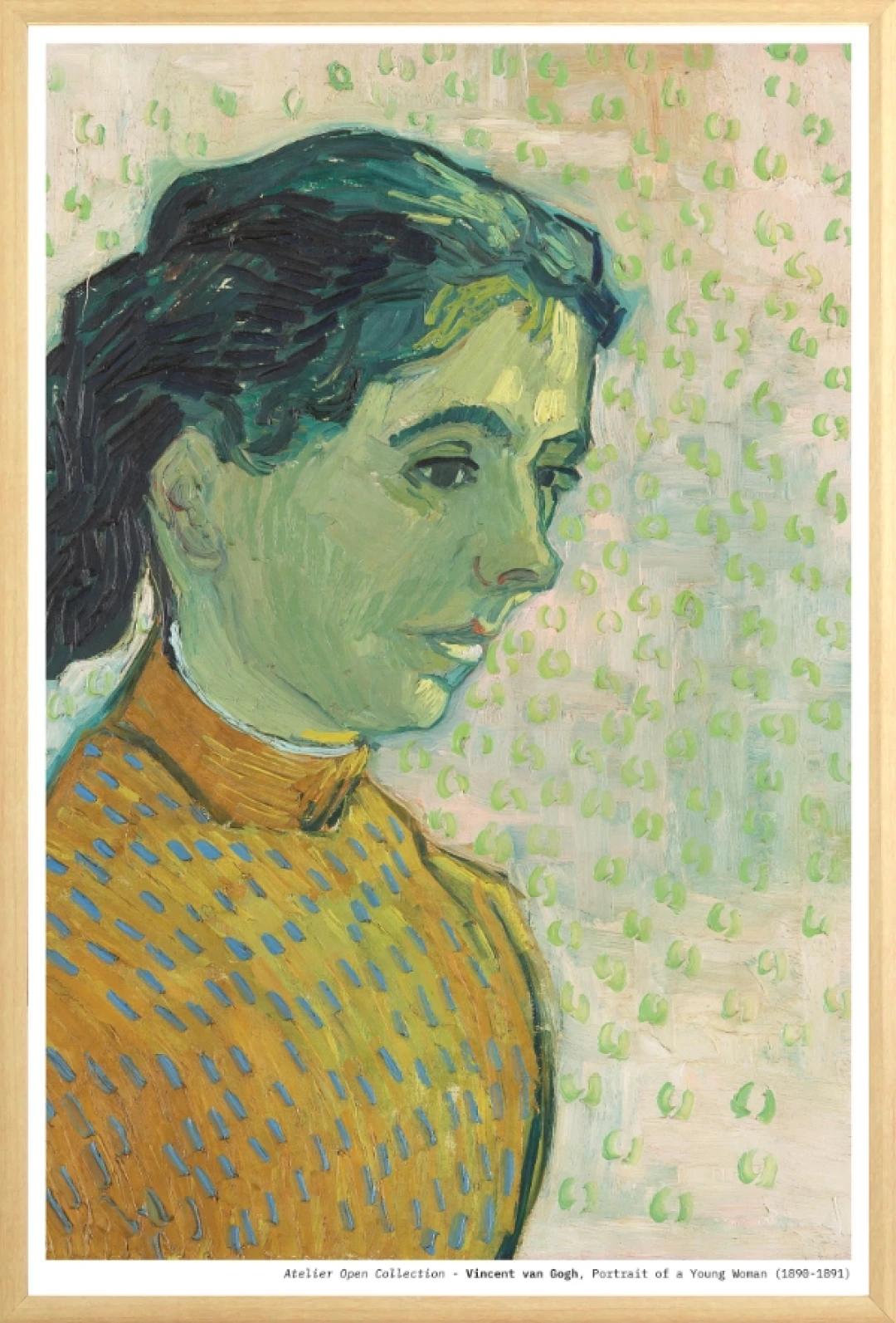 The background’s repeated green strokes hint at influences from decorative arts and Japanese prints; an inspiration seen across Van Gogh’s late portraits. The sitter’s downward gaze and the subtle modeling of her features create a sense of quiet reflection, contrasting with the vivid, energetic brushwork typical of the artist’s earlier years.
