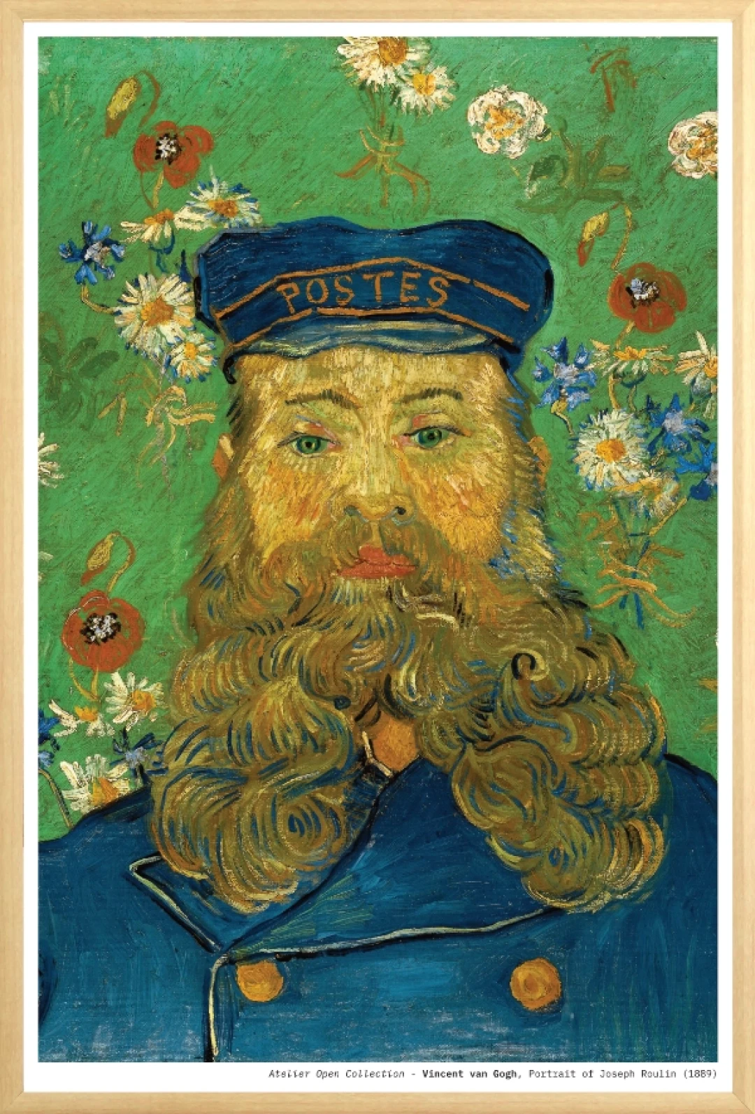 Van Gogh’s Portrait of Joseph Roulin is one of the most vibrant and expressive portraits from his time in Arles. Joseph Roulin, the local postman and a close friend of the artist, sits confidently in his bright blue uniform surrounded by a lush, decorative floral background. His flowing beard, painted in swirling strokes of gold and ochre, becomes a centerpiece of the composition- alive with movement and personality. This reproduction captures the intensity of Van Gogh’s color palette and the distinctive rhythmic brushwork that defines the original painting, offering a striking focal point for any interior.